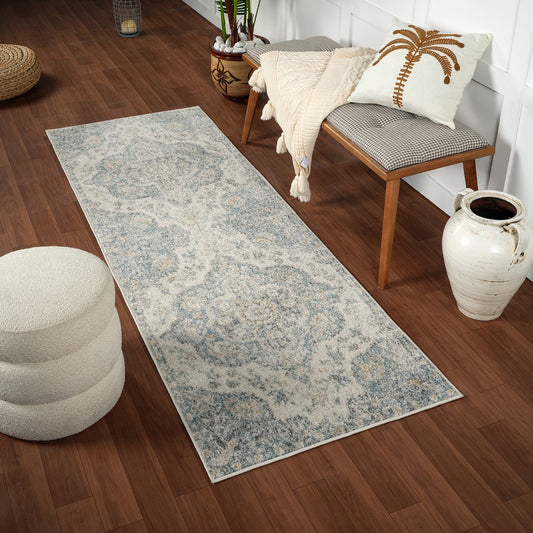 NEELAM Vintage Traditional Oriental Boho Sky Blue/Light Grey/White/Navy Area Rug